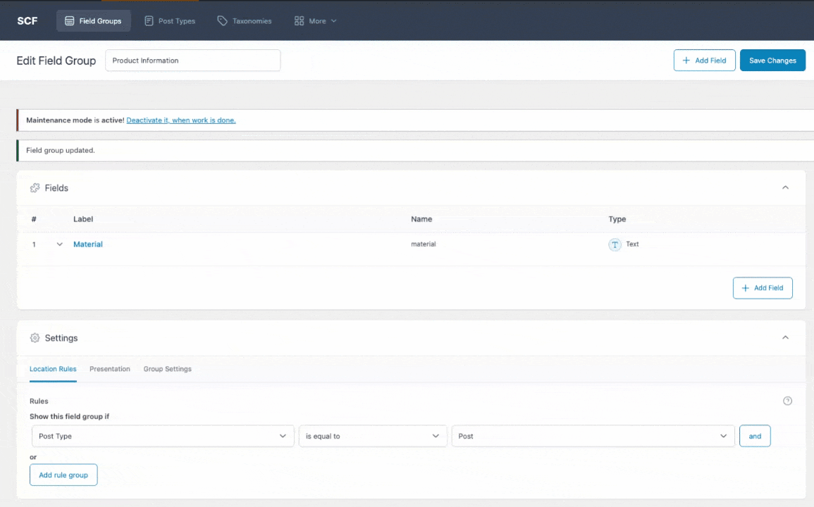- Navigate to SCF (or Custom Fields) > Field Groups.